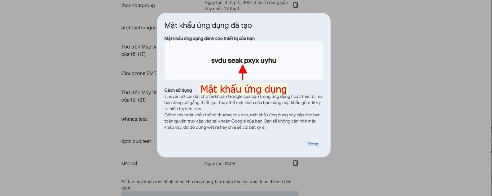 Sau khi tạo thành công, Google sẽ hiển thị một chuỗi mật khẩu gồm 16 ký tự.
