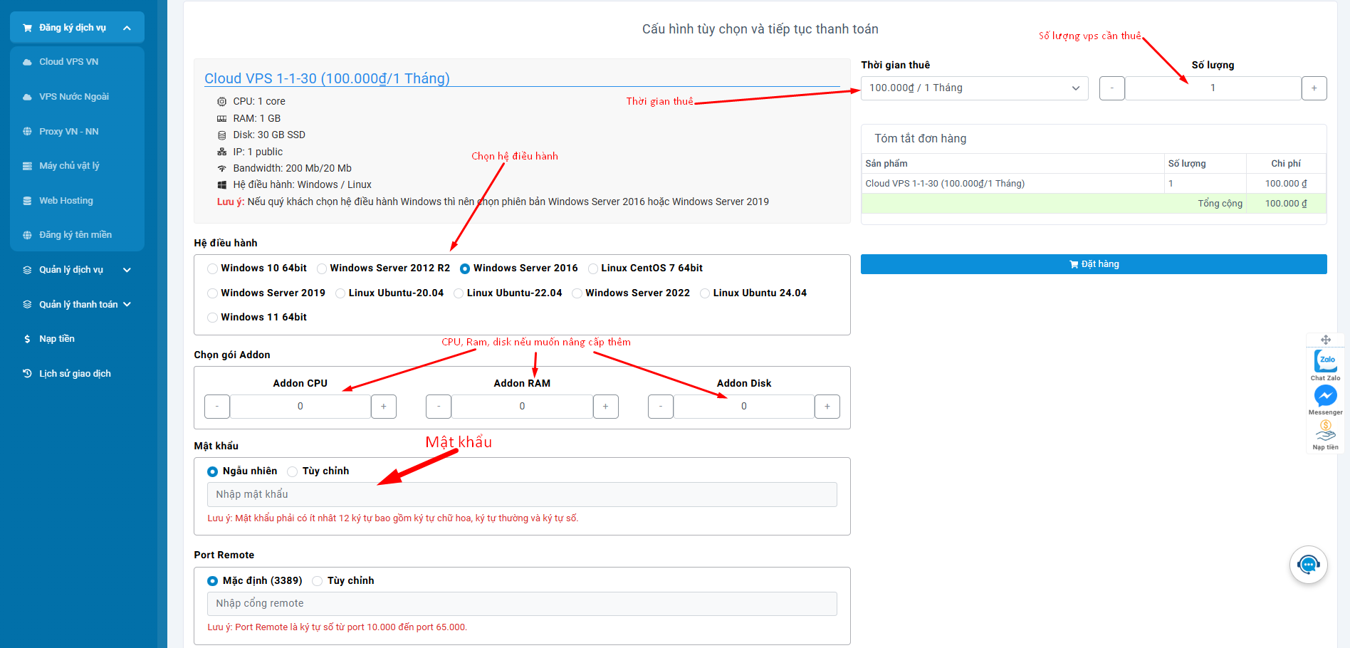 Đến trang thiết lập, Quý khách nhập số lượng VPS cần mua, thời gian sử dụng, hệ điều hành,… theo nhu cầu
