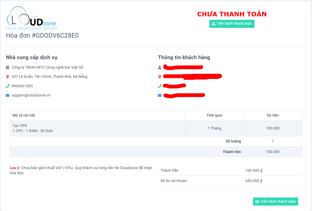 Bước 3: Tiến hành thanh toán Hóa đơn & Hoàn tất dịch vụ đăng ký VPS Việt Nam.