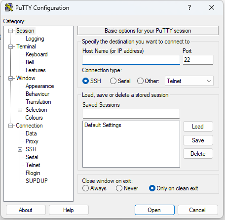 Nếu bạn đang sử dụng hệ điều hành Windows trên máy tính của mình và muốn đăng nhập vào máy chủ Linux thông qua SSH, bạn sẽ cần một phần mềm hỗ trợ làm việc này. Phần mềm thông dụng nhất đó là PuTTY, bạn chỉ việc tải về và chạy là sẽ ra bảng đăng nhập vào máy chủ như hình dưới.