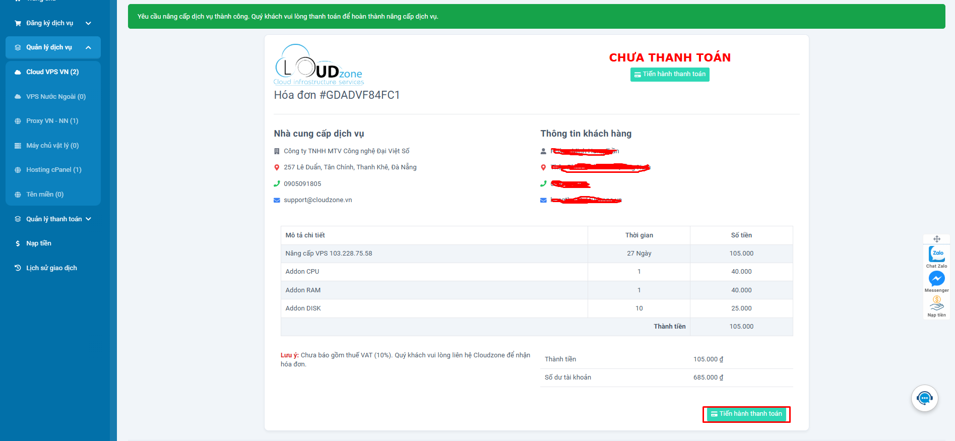 Chúc mừng Quý khách đã thanh toán thành công và hoàn tất dịch vụ nâng cấp cấu hình VPS.